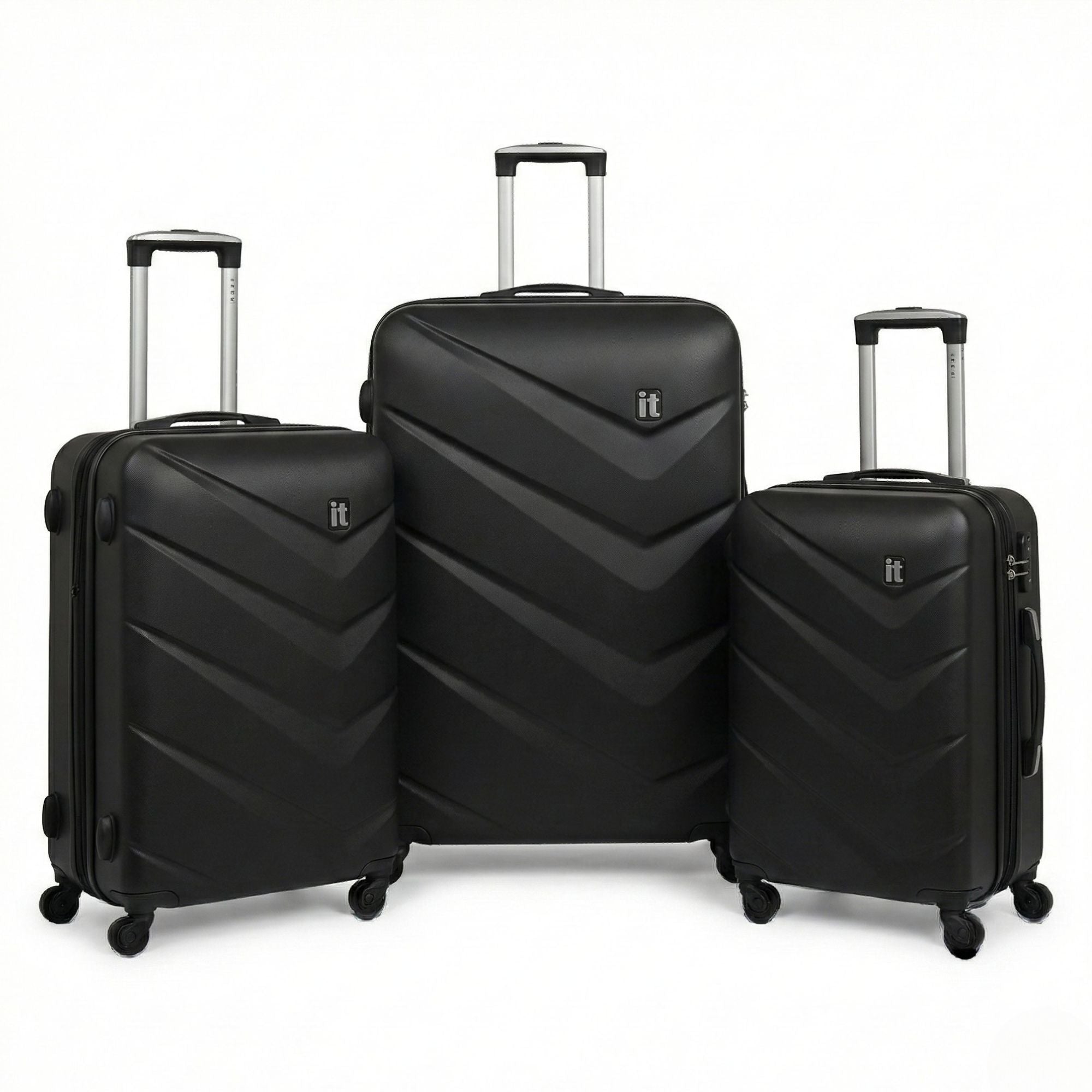 Pack all of the items you need for your next big getaway in this spacious and functional Chevron 3 piece set from it luggage! The unique ABS chevron effect offers a fashionable finish and great protection. Featuring a split book style opening, each case offers two large compartments for easy packing and organization. The fully lined interior is complete with a zip around divider, and clothing tie down straps to keep your belongings neatly stowed away. Each case offers up to 25% additional packing capacity with a single expander, and features easy-grab top and side handles to make your next trip as comfortable and smooth as possible. The Chevron 3 piece set is a must-have for your next adventure!